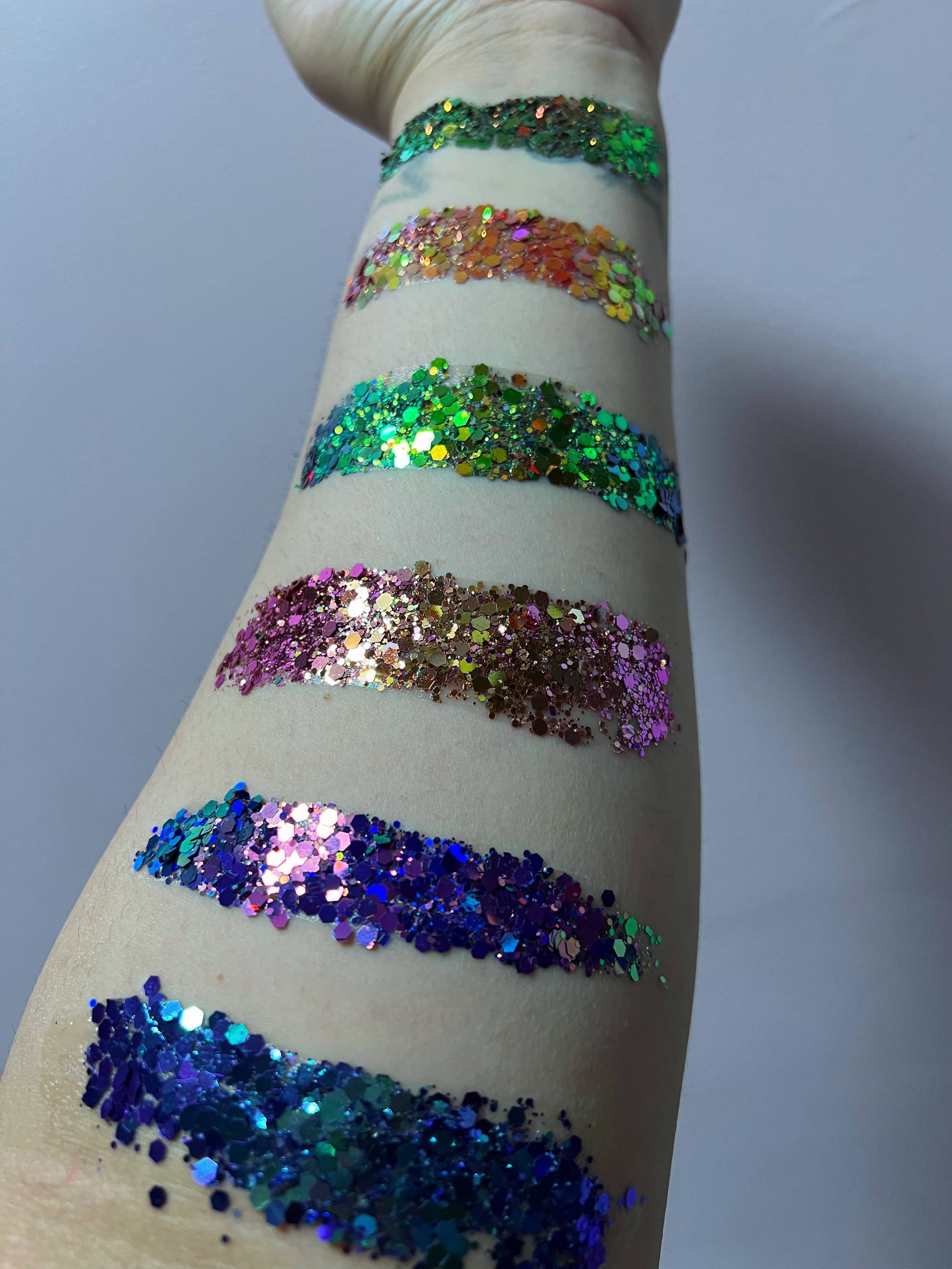 6 Bomb color-shifting chunky glitters. Suitable for your face, body, eye shadow, lips, cheeks, makeup, nail art, and more.